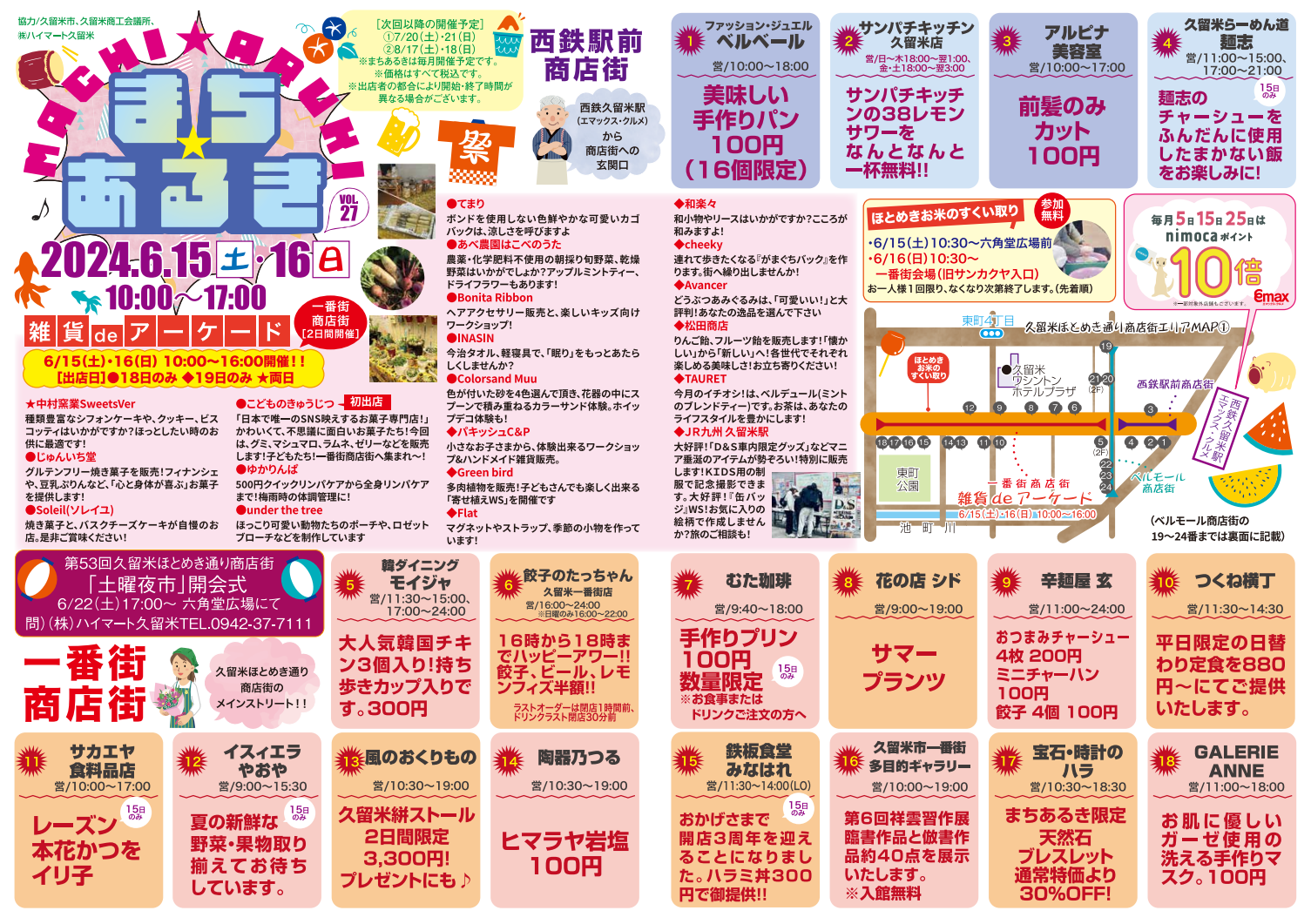 西鉄久留米駅から六ツ門までの商店街内の店頭に、飲食販売やゲームコーナーが登場します。